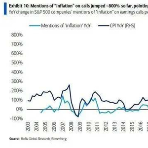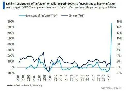 自从5月初开始,企业第一季度盈利季节的财报会议上,关于「更高的通货膨胀」的种种言辞就不绝于耳,与去年同期相比,通胀言论在企业高管口中出现的频率猛增了800%之多。这也就难怪,美国银行首席股票策略师萨布拉玛尼安(Savita Subramanian)当时也不能不感叹:「从绝对数字角度看,企业在财报会议上提及通货膨胀的频率已经接近2011年的创纪录水平,‘暂时性’的恶性通货膨胀已经在前方不远处了。