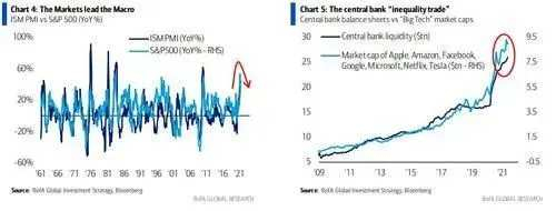 不必说,联储和其他这些央行一手打造的各种资产泡沫,还在让财富不均的情况变得日益严重。虽然央行们不可能承认,但是哈内特明确写道,市场的表现其实几乎总是领先于宏观经济的——换言之,可以视作经济的领先指标,而联储又知道他们自身的能力,只能通过信用利差和股票价格来影响企业和消费者的行为,于是乎,他们的政策完完全全都是在针对华尔街的。