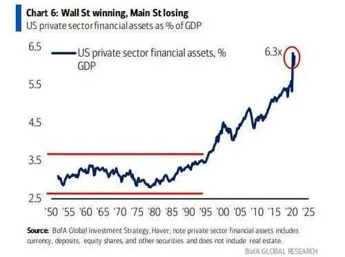 可是,问题在于,从遥远的格林斯潘年代,对长期资本管理公司的「联储对策」式救援以来,华尔街的持续大繁荣正变得与现实经济和普通人的福祉距离日益遥远。正如下图所示,美国金融资产的盘子现在已经相当于国内生产总值的6.3倍。