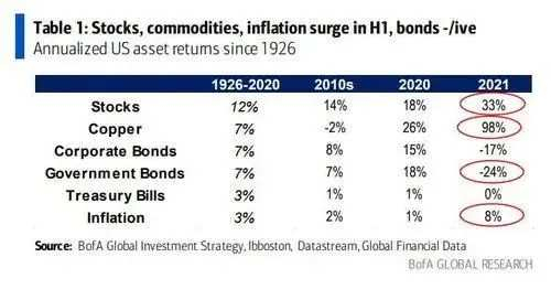 综上所述,哈内特指出,虽然美股几乎每天都在创下历史新高,但是这超级派对现在正在走向散场,而导致其落幕的因素包括高企的通货膨胀,转向鹰派的央行,疲软的经济增长等。加息、监管、再分配的所谓3R走高,头寸、政策、利润的所谓3P见顶将导致股票/信贷下半年的回报变低,甚至成为负数,这就使得做多通货膨胀资产和防御性股票资产的所谓杠铃交易成为最佳选项。