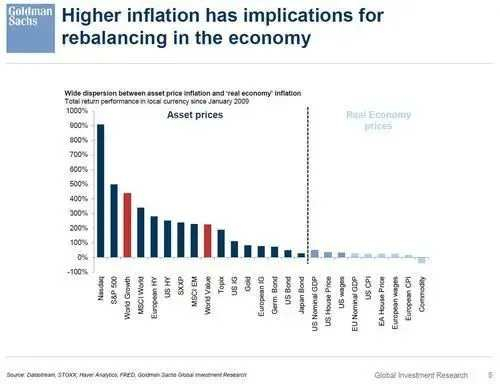 随后,这位美银首席投资官对资产膨胀进行了分析,在这个问题上,甚至保守的高盛也不能不承认,与温和的经济膨胀相比,资产膨胀已经过度严重了——尽管经济膨胀其实现在也已经开始上行了。