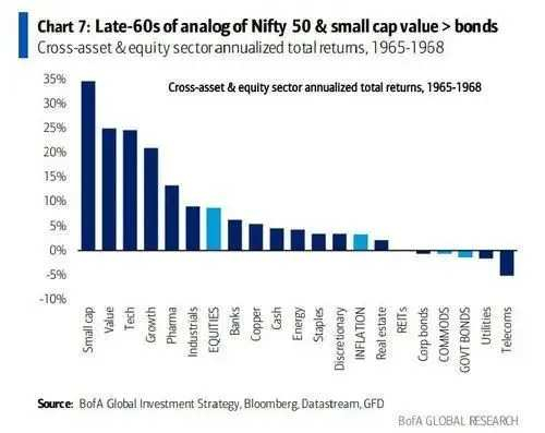 哈内特这种判断的根据是,在他看来,当前美股市场的买进狂热其实和20世纪60年代晚期颇为相似,「当时,由于财政政策的过剩和联储的屈服,通货膨胀与利率宣告脱钩,结果就是,所谓漂亮50股票与小型价值型股票形成了杠铃,表现要大幅好于债券」。