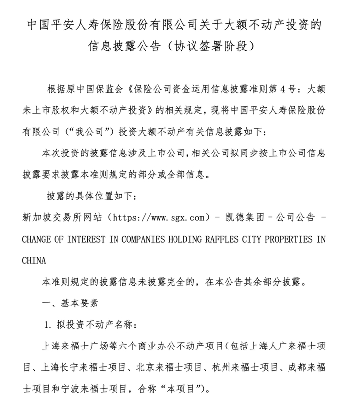 6月28日,凯德集团披露,与中国平安人寿签署了合作协议,向后者出售中国6个来福士资产组合部分股权。