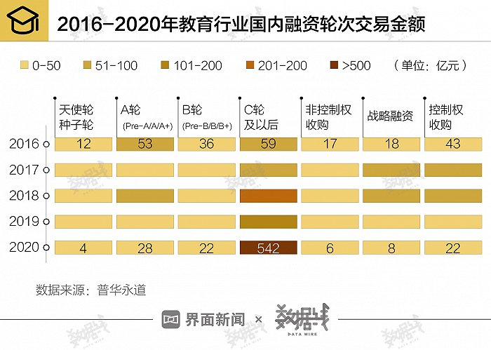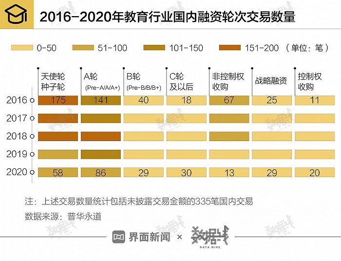 教培企业的“门槛”越来越高。据普华永道发布的报告数据,从融资轮次来看,2016年至2020年,国内教育行业天使轮融资和A轮融资数量分别下降66.9%和39%。C轮及以后的融资数量增长66.7%。早期融资数量大幅下降,说明教育行业中小企业“进场”难度越来越大。