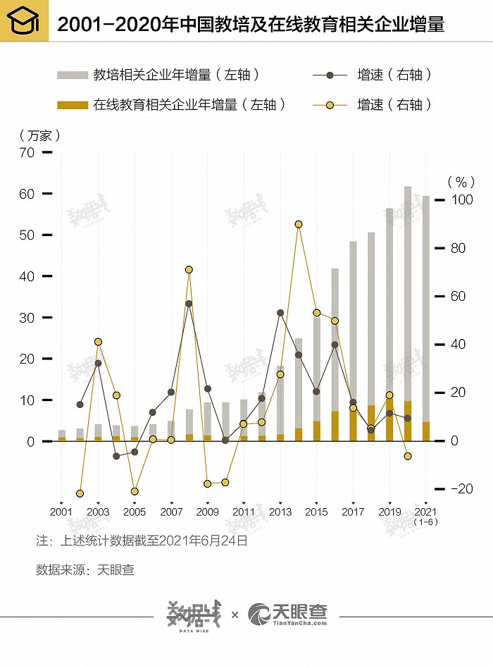 据天眼查数据,2001年至2020年,中国教培相关企业年新增数量20年间从2.7万家增长至61.7万家,涨幅近22倍。2008年和2013年,新增教培企业数量两次爆发式增长。这一时期的教培市场正在疯狂扩张。新东方、学而思等老牌企业相继上市,吸引了大批玩家入场。教培行业的创业热点正在从K12课外辅导向在线教育转变。