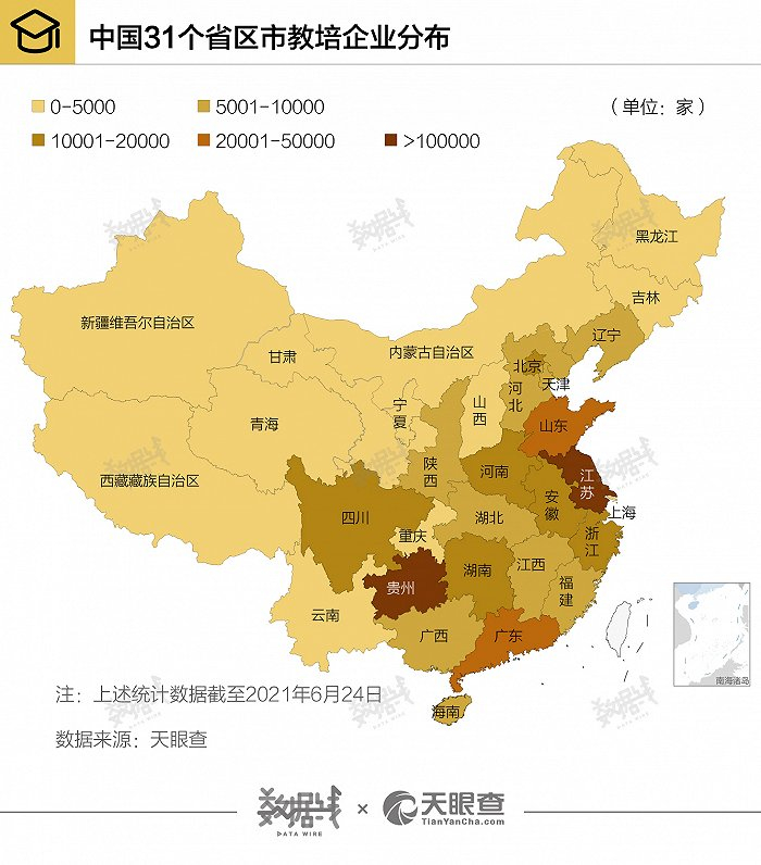 从分布情况来看,中国教培企业多集中于东部沿海省份。其中,江苏省教培企业最多,为14.5万家。贵州省有10.7万家教培企业,排名全国第二。