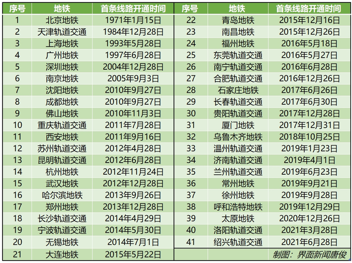 最近两年新开通地铁的城市不多。2019年有6座城市步入地铁时代,2020年仅太原新开地铁,2021年3月洛阳开通地铁,绍兴成为中国内地第41座开通地铁的城市。