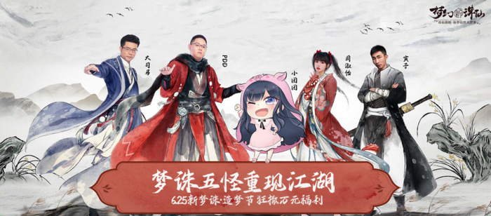 在大众圈层之外,为了触达核心游戏用户,《梦幻新诛仙》也找了很多游戏圈的KOL为其背书。比如让游戏主播PDD、大司马、寅子、周淑怡、小团团组成梦诛五怪,并以固定队社交玩法,作为联动直播内容,凸现游戏的MMO属性。