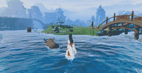 这种大世界中的拟真细节还能在NPC与动物身上找到。例如玩家靠近后,NPC的视线会自动追踪玩家,同时也会向玩家打招呼或作揖;蛤蟆、蝴蝶等动物,看到玩家逼近后,也会四散逃离,符合自然界动物的真实习性。