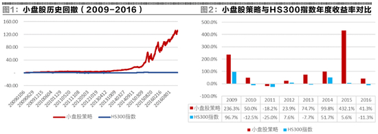选择市值因子最小数十只个股(剔除ST)构建组合,定期换仓,在考虑足够的佣金、印花税和滑点等交易成本以后,该小市值策略自2009年至2016年末的历史回测结果如图1和图2。