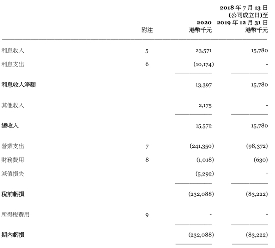 财报数据显示,天星银行2020年实现总收入为1557.2万港元,其中利息收入2357.1万港元,利息支出1017.4万港元;营业支出2.41亿港元,税前亏损2.32亿港元;总资产为28.8亿港元,总负债为16.77亿港元,资产负债率为59.47%。
