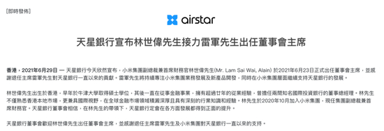 6月29日,香港虚拟银行天星银行官网发布公告称,小米集团副总裁兼首席财务官林世伟接替雷军,于2021年6月23日正式出任董事会主席。