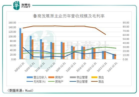 鲁商发展原主业包括房地产销售、物管及酒店三项。从房地产历年营收及毛利率看,公司房地产业务规模虽然维持较为稳定增速,但毛利率近年有下滑迹象,2020年毛利率已跌至近20%。房地产业务占了鲁商发展收入大部分。