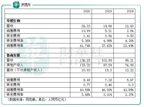 华熙生物过去三年的研发投入分别是0.553亿元、0.94亿元及1.41亿元,对应研发费用率分别为5.36%、4.98%及4.20%,同期鲁商发展的研发投入分别为0.77亿元、0.46亿元及0.3亿元,对应不计房地产收入外的总营收(为方便比较)计算得出的研发费用率分别是3.68%、3.01%以及2.27%。