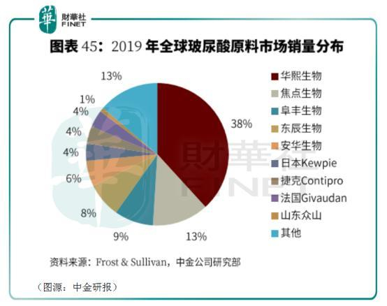 弗若斯特沙利文统计显示,2019年全球玻尿酸销量占比,华熙生物占了38%,焦点生物占13%,东辰生物占8%,分列行业一、二、四。