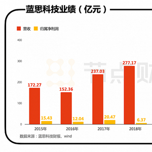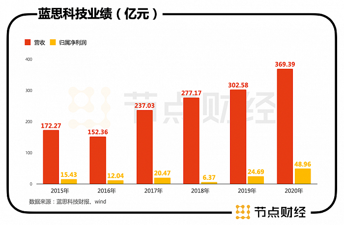 据其财报显示,2015年-2020年,蓝思科技营收从172.27亿元增长至369.39亿元,归属于上市公司股东的净利润从15.43亿元增长至48.96亿元。
