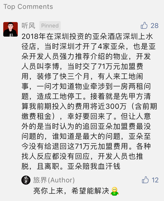 “越(到)后面所有亚朵酒店负责人极端不负责任,好像让我们跪舔才可以得到解决,完完全全在烧业主的钱!业主是不可能挣到钱的。”至今,听风还在和亚朵酒店索要加盟管理费,他希望能联合更多亚朵酒店加盟的受害者进行联合起诉。