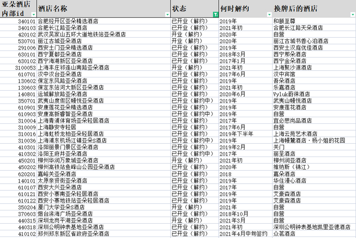 旅界统计4月亚朵酒店内部清单已解约酒店一览表