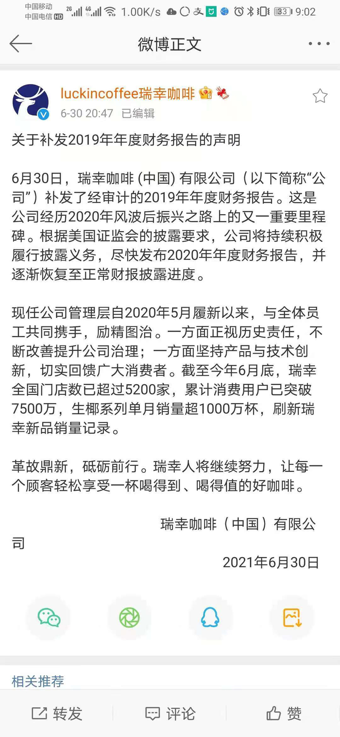 以上为瑞幸咖啡 (中国) 有限公司(以下简称“公司”)补发的经审计的2019年年度财务报告。瑞幸表示根据美国证监会的披露要求,公司将持续积极履行披露义务,尽快发布2020年年度财务报告,并逐渐恢复至正常财报披露进度。
