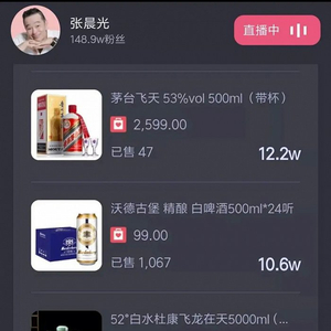飞瓜数据显示,这是张晨光第8次在抖音进行直播,销售额超400万,带货的商品中接近77%为酒类,包括茅台、五粮液、杜康等多个知名白酒品牌,商品来自酒仙网旗舰店、也买酒酒水旗舰店以及一些酒类专营店。其中,一款售价为2599元的茅台飞天白酒,销售额达到133.4万,占全场GMV的30%以上。