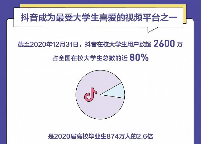 对于短视频平台更是同样如此,根据抖音发布的《2020抖音大学生数据报告》显示,截至2020年12月31日,抖音在校大学生用户数已超2600万,占全国在校大学生总数的近80%,校园生活的短视频内容也是抖音中不可缺少的重要组成部分。