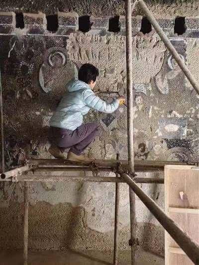赵莉在克孜尔石窟修复壁画的现场工作照片。