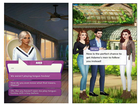 中文在线在海外除了明星产品Chapters-Interactive stories,其实去年8月和9月也发行了两款新品“Spotlight: Choose Your Romance和Kiss: Read & Write Romance。前者也是互动小说,与Chapters的区别是,Chapters的人物有表情但不能走动,主要靠背景浮动,而Spotlight给人物加入了一些肢体语言。