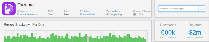 “Dreame”安卓端下载量和收入(上为 21 年 4 月、下为 20 年 12 月) | 数据来源:Sensor Tower