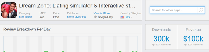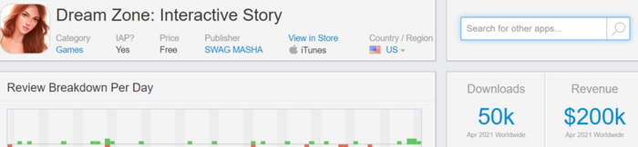 2020年白俄罗斯发行商Swag Masha推出的男性向互动小说游戏Dream Zone,4月iOS端5万的下载量,为其带来了20万美元的收入。应用介绍里写着,在这里,你将成为亿万富翁、当红明星、世界冠军、科学家……这样看来与App的名字确实很契合,但事实上网文也好,游戏也好,用户主要追求的是当下的刺激,爽点有了,付费点可能也就来了……这款游戏在中欧和北欧的下载排名较高。
