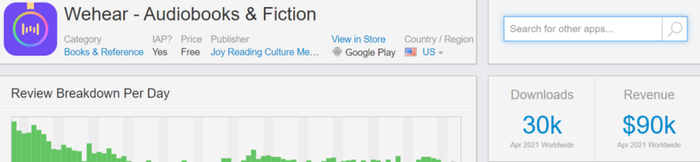 同时笔者也观察到已经有出海厂商在做有声小说App。2020年9月上架在Google Play的Wehear: Audiobooks & Fiction,就在两周前的5月18日,又上架了App Store。该应用6月5日在美国iOS和Google Play平台图书类下载榜分别第29名、54名。