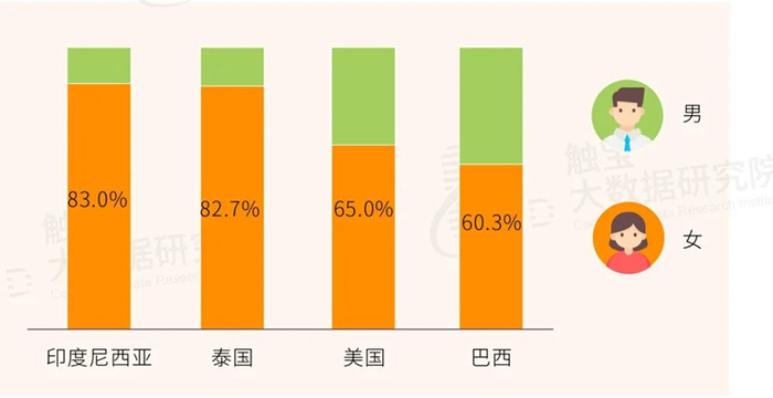 这里想要插一句的是,东南亚地区网文读者以女性为主,据触宝大数据统计,印尼和泰国的女性用户都占比80%以上。但虽然整体上网文读者都以女性为主,但在不同国家还是有一些差别的。