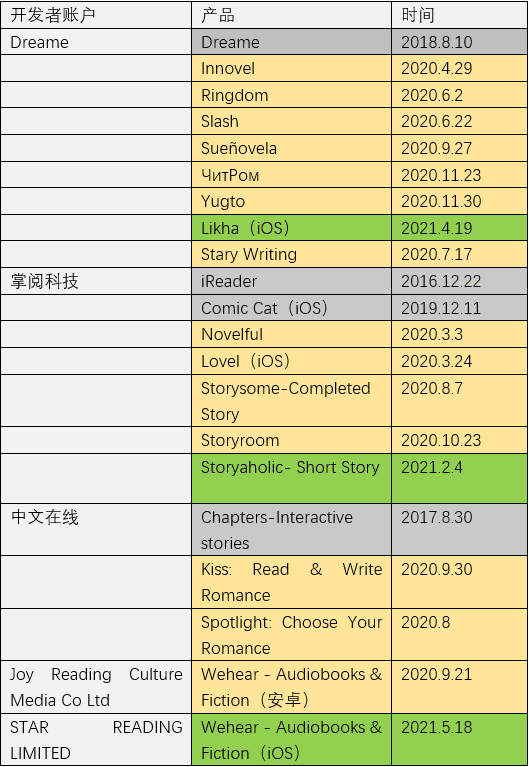 笔者梳理了Dreame厂商 Stary、掌阅科技、中文在线几个头部厂商在海外发行的主要产品以及上线时间,另外收录了一款观察到的新产品,有声小说应用“Wehear”。