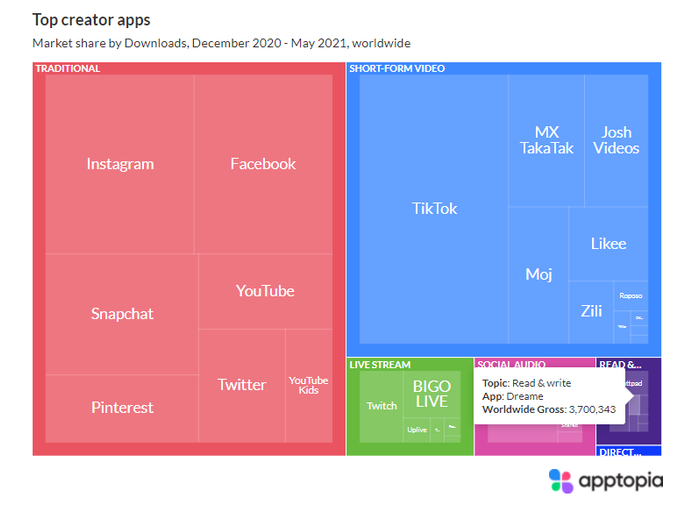 在小说App出海最初的几年,抓住风口的STARY用更偏向于本地创作者平台的模式,大幅降低版权和翻译成本,在商业化跑通的前提下,支持厂商快速增长。根据Apptopia的最新数据,在Read&Write这一模式的创作者经济中,Dreame按照App安装量来看市场份额的话(2020年12月~2021年5月),已经是全球第3大平台了,仅次于Webtoon。