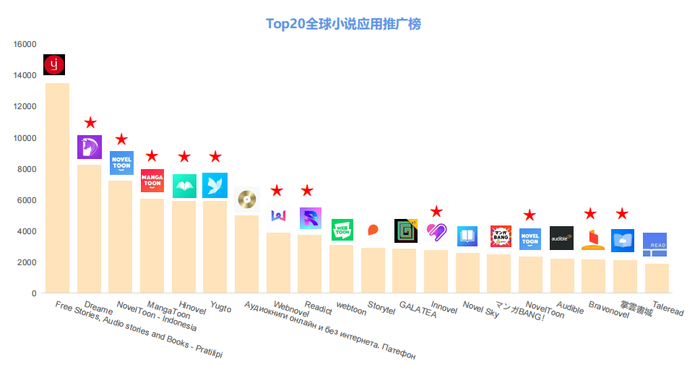 2021 Q1 Top 20 全球小说应用推广榜,标星为中国厂商 | 数据来源:App Growing Global