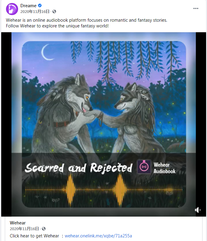 其实做有声小说出海的厂商,一直以来的操作一般是将海外知名度比较高的内容直接“缩减成精华”的短内容,但存在版权争议。而Wehear选择了与Dreame合作,将Dreame热门小说改编成有声读物。Dreame官方账号也在Facebook上为Wehear背书,还在今年3月26日与Wehear同步宣传征集故事播音员。Dreame平台的作者也在主页简介里向读者们安利。