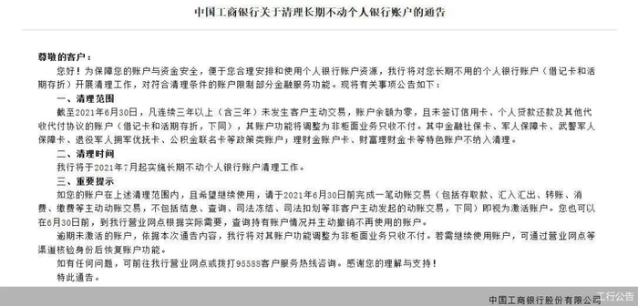 根据工商银行日前公告,该行将于2021年7月起对用户长期不用的个人银行账户(借记卡和活期存折)开展清理工作,对符合清理条件的账户限制部分金融服务功能。百信银行同样在近日发布公告称,该行将于2021年7月起实施个人长期不动户清理工作。