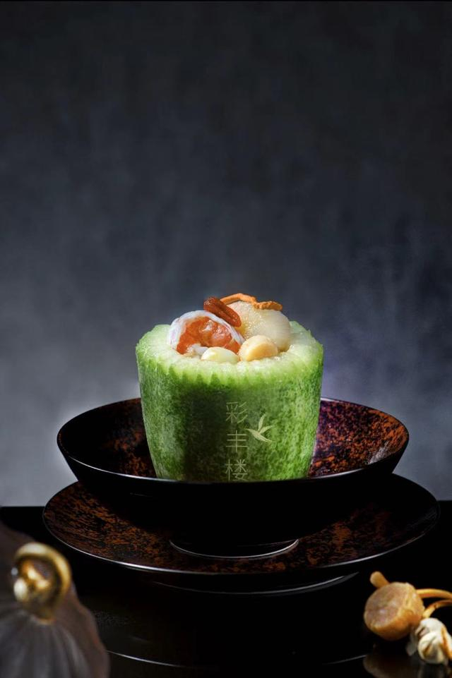 除了传统名菜,创新菜更是颜值极高,口味出奇制胜。比如一道翠玉珍馐,翠玉般色泽的迷你瓜盅与瑶柱、带子、虫草花、松茸等一同炖煮,汤清味淡,回味甘甜;另一道龙藏彩凤翼,菜如其名,看似平常,内藏乾坤。去骨的带皮鸡翅内酿入炒制后的虾仁、瑶柱、香菇粒、笋丁等,风干后再以清油炸至外脆里嫩,与不同口味的蘸酱相互搭配,别有风味。