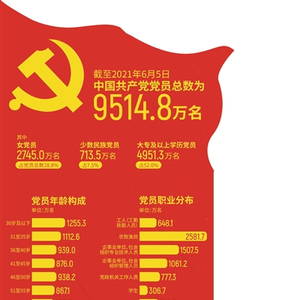 中央组织部最新党内统计数据显示,截至2021年6月5日,中国共产党党员总数为9514.8万名,党的基层组织总数为486.4万个。历经百年风雨,中国共产党从小到大、由弱到强,从建党时50多名党员,发展成为今天已经拥有9500多万名党员、在14亿多人口的大国长期执政的党。