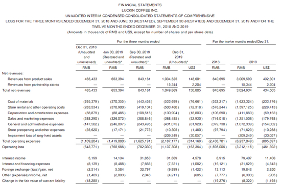 根据瑞幸官网,经重新审计后,公司在2019年的净营收为30.25亿元,其中来自产品销售的营收达30.10亿元,来自于合作门店的营收为1530万元。相比之下,公司在2018年的净营收为8.41亿元。