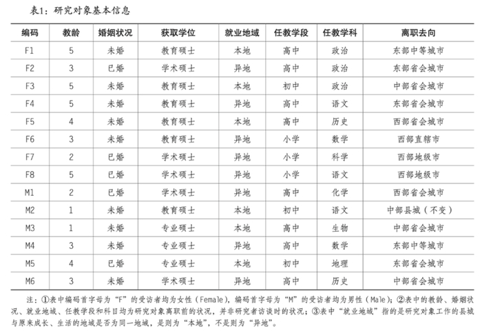 为了对研究对象和研究问题形成更加清晰的认识,我们对研究对象做如下限定。首先,根据《中长期青年发展规划(2016—2025年)》,青年的年龄范围在14~35周岁[20],本研究的研究对象是指年龄在25~35岁、获得研究生学历或拥有特殊专业技能、在县级行政区划范围内有过离职经历的青年人才,具体研究对象选取的是曾在县域中小学有过离职经历的所有获得研究生学历的青年教师,包括教育硕士、学术型硕士和专业型硕士。