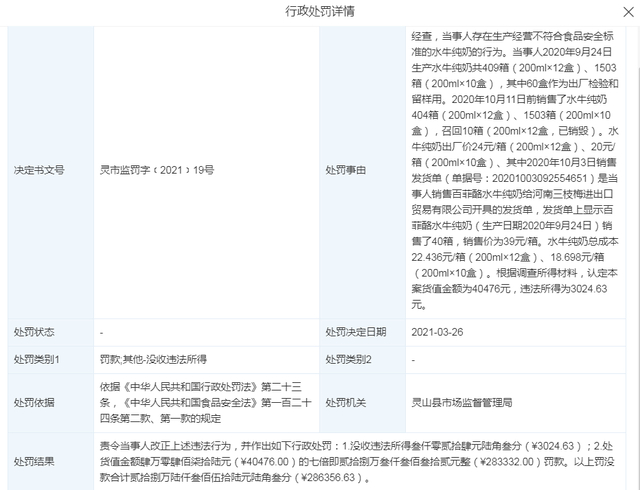 天眼查显示,2021年3月26日,百菲乳业因生产经营不符合食品安全标准的水牛纯奶,被灵山县市场监督管理局没收违法所得3024.63元,并被处以货值金额(40476元)7倍罚款283332元。经查,百菲乳业2020年9月24日生产水牛纯奶共409箱(200ml×12盒)、1503箱(200ml×10盒),其中60盒作为出厂检验和留样用。2020年10月11日前销售了水牛纯奶404箱(200ml×12盒)、1503箱(200ml×10盒),召回10箱(200ml×12盒)。