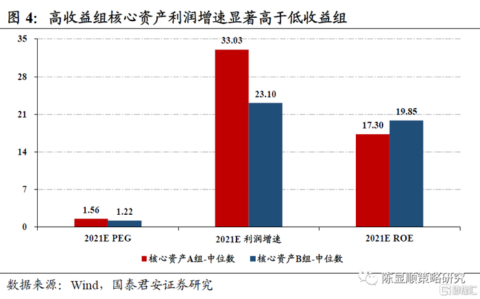 From the perspective of financial indicators, the typical characteristic of the two groups of stocks lies in the difference in profit growth.Among them, from the level of ROE, the core asset group An is 17.30%, on the contrary, it is 19.85% lower than the core asset group B, which shows that the sector with the top growth rate since 2021 is not at a higher ROE level; from the PEG index, group A 1.56x is higher than group B 1.22x. In contrast to the projected profit growth in 2021, the growth rate of core assets in group An is 33.03%, which is significantly higher than that in group B by 23.10%. Profit growth is the key to distinguish the obvious gap between the two types of core assets.