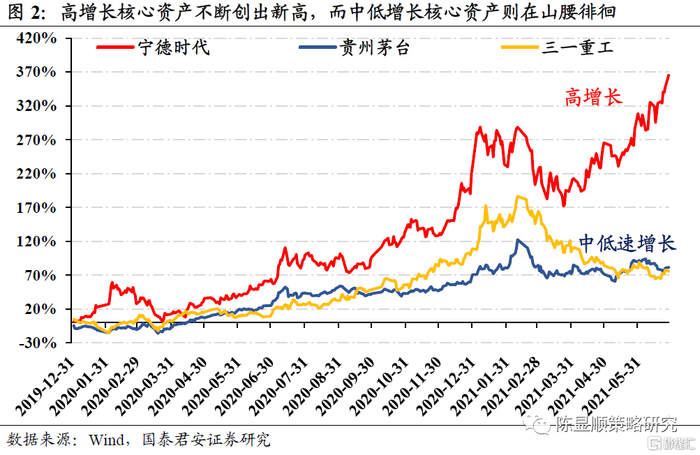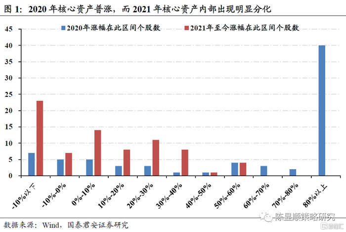 In 2020, the market showed a general rise in core assets, while in March 2021, with the bursting of the blue chip bubble, there began to be obvious differentiation within core assets, and the share prices of some core assets that still maintained high growth reached a new high. on the other hand, the growth of some core assets which have stalled is still negative so far this year.
