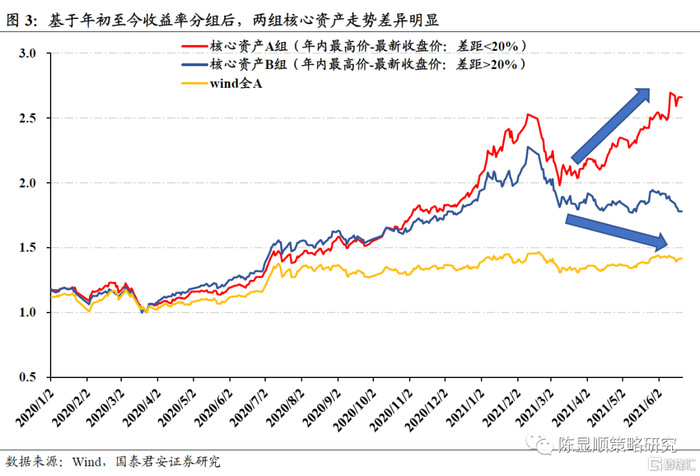 基于核心资产分化的走势,本文依照收益率的特征将其分为两组,一组为年内最高价与最新收盘价差距在20%以下,即通过本轮行情基本收复3月份跌幅甚至创出新高的品种,另一组为年内最高价与最新收盘价差距在20%以上的品种,即当前未能收复的品种,从走势上来看,两组不同的品种在2020年走势上几乎保持一致,而2021年3月以来明显分化,其中A组指数已经在近期创出新高。