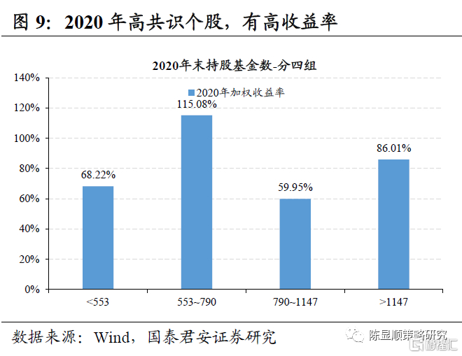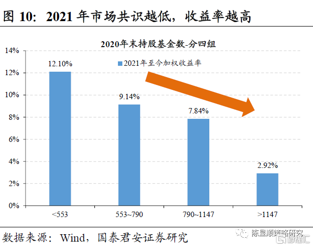 The lower the consensus of the core assets, the higher the rate of return so far this year.We use the "number of fund holders" as an indicator of investor consensus on a stock. In the previous outsourcing report, we analyzed the factors at the trading level of core assets and divided them into four groups to examine the rise and fall of 2020 and early 2021 according to the number of shareholding funds of core assets at the end of 2020.