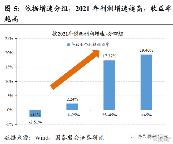 若按照ROE和利润增速将核心资产进行分组,可发现2021预计利润增速越高的品种,年初至今收益率越靠前。按照净利润增速由低至高的顺序进行排列,其年初至今收益率(流通市值加权)也呈现出由低到高单调递增的趋势。其中2021年全年预期净利润增速在45%以上的组合年度加权收益率达到19.40%,而净利润增速在11%以下的核心资产组合加权收益率仅为-2.51%。