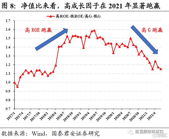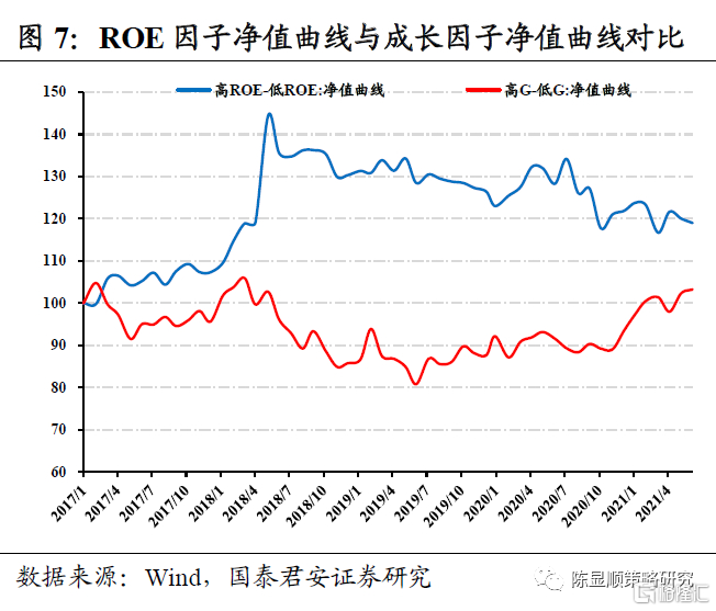 Since August 2020, the effectiveness of the ROE factor relative to the high growth factor has gradually weakened. From the ratio of the two net values, the ratio of high ROE-, low ROE/, high G and low G has declined from 1.6 to 1.1 since June 2020.