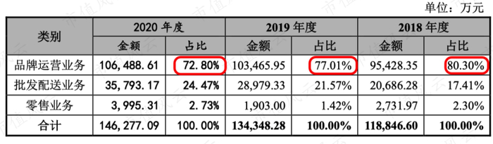 主要原因是品牌运营业务毛利率远比批发配送业务毛利率高,以2020年为例,品牌业务毛利率为49.16%,批发配送业务毛利率为10.62%。