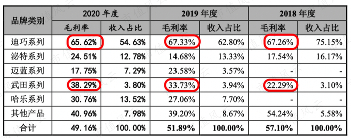 迪巧品牌的毛利率甚至能达到67%左右,其次是武田品牌,2020年毛利率为38.29%。