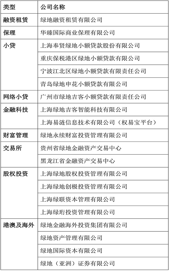 绿地金融官网披露,截至2019年末,绿地金融下属控股的金融及类金融机构包括1家境外证券公司、1家境内融资租赁公司、2家金融资产交易所、4家区域性小额贷款公司、1家互联网小额贷款公司,及6家私募基金管理公司等。